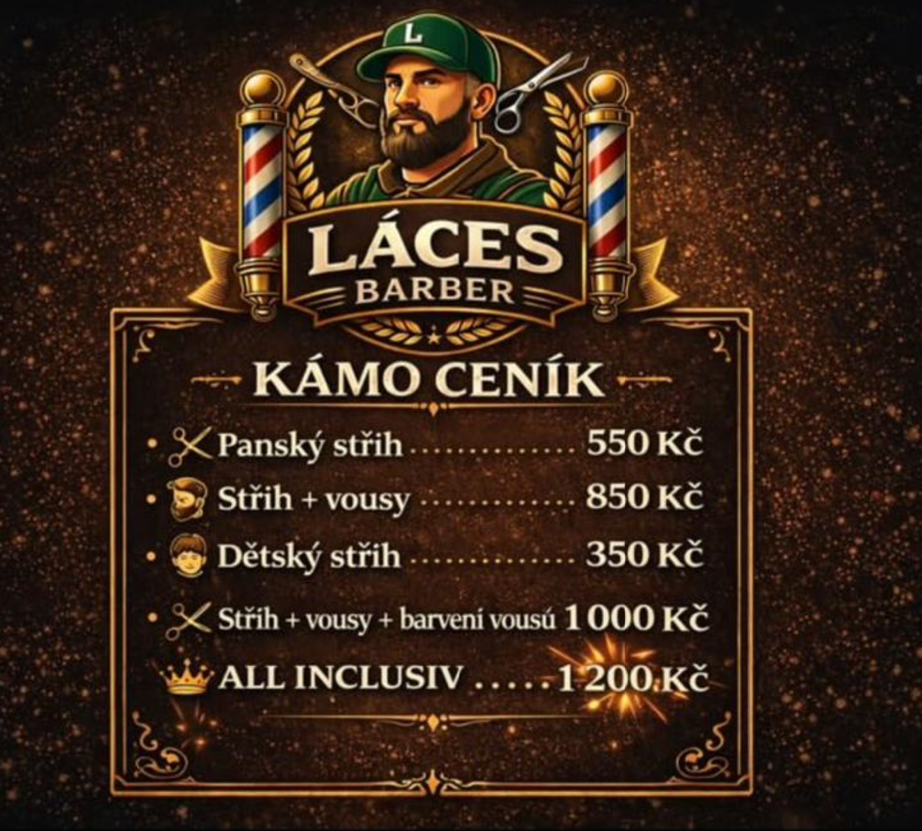 Vítejte v Láčes Barber, kde se specializujeme na klasické pánské strihy vlasů a vousů. S naším zkušeným týmem a příjemnou atmosférou se u nás budete cítit jako doma. Věříme, že každý zákazník si zaslouží kvalitní a profesionální péči o svůj vzhled.